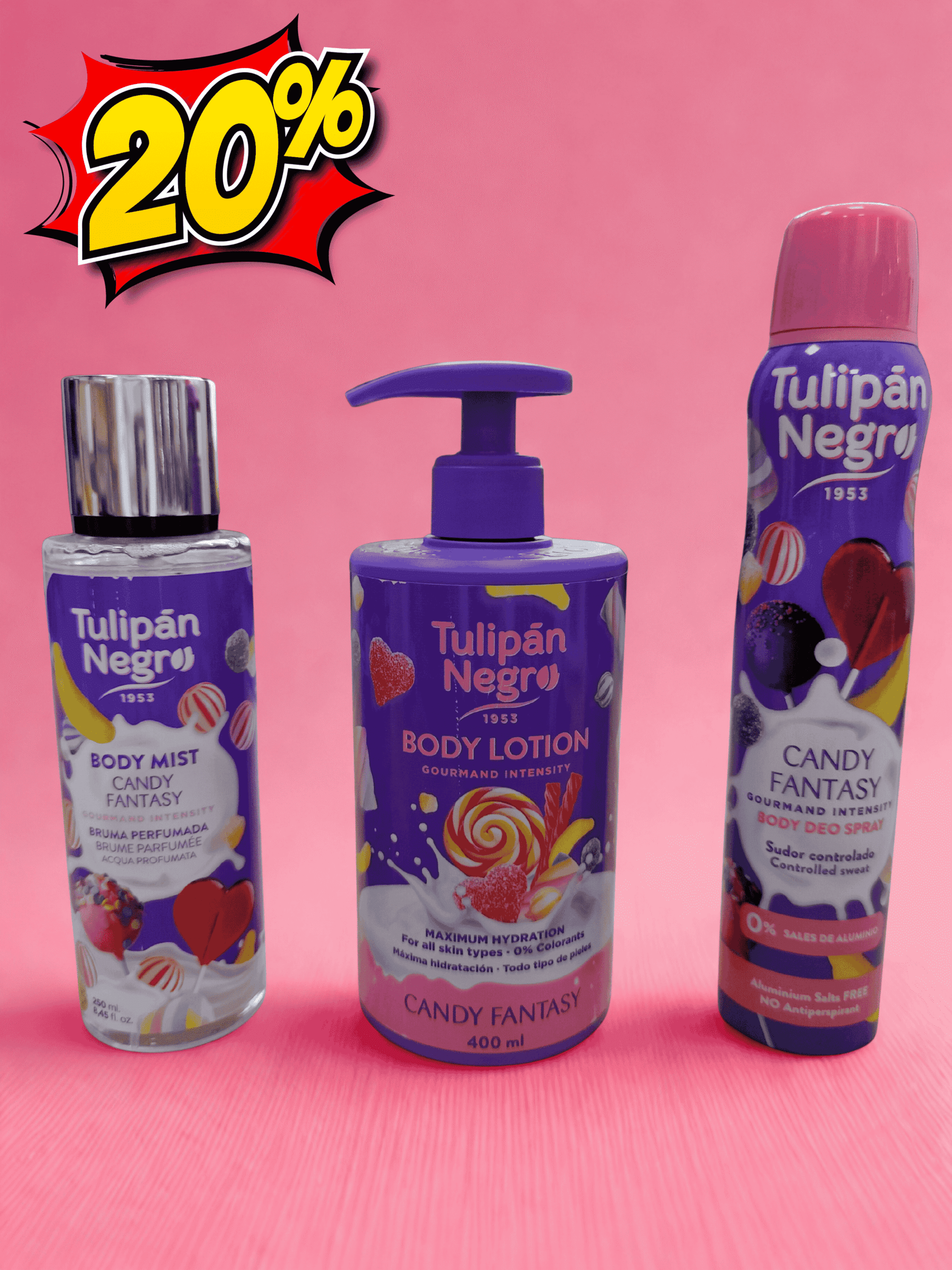 La BOX Regalo Tulipan Negro – Candy Fantasy racchiude tre prodotti coordinati della stessa profumazione, pensati per avvolgere il corpo in un profumo goloso che ricorda caramelle, zucchero filato e dolciumi 🍭💜
