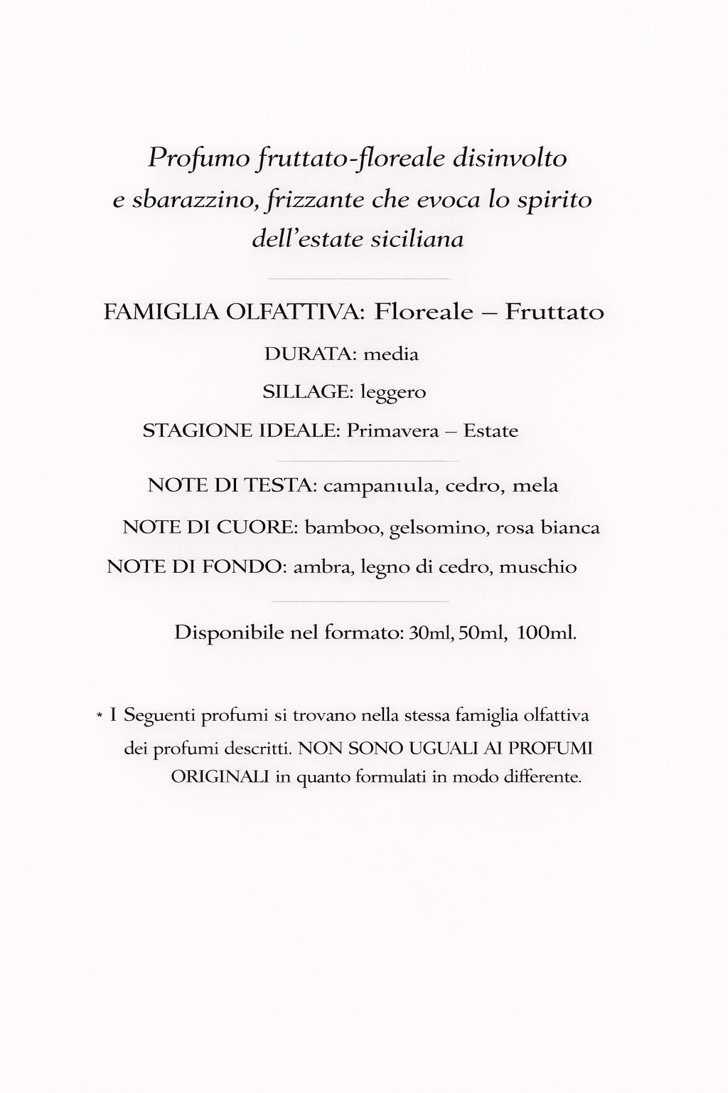 * I Seguenti profumi si trovano nella stessa famiglia olfattiva dei profumi descritti. NON SONO UGUALI AI PROFUMI ORIGINALI in quanto formulati in modo differente.