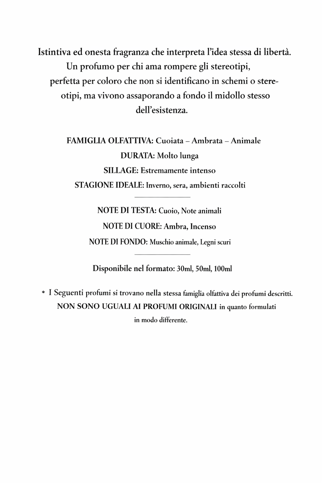 Istintiva ed onesta fragranza che interpreta l’idea stessa di libertà. Un profumo per chi ama rompere gli stereotipi, perfetta per coloro che non si identificano in schemi o stereotipi, ma vivono assaporando a fondo il midollo stesso dell’esistenza.