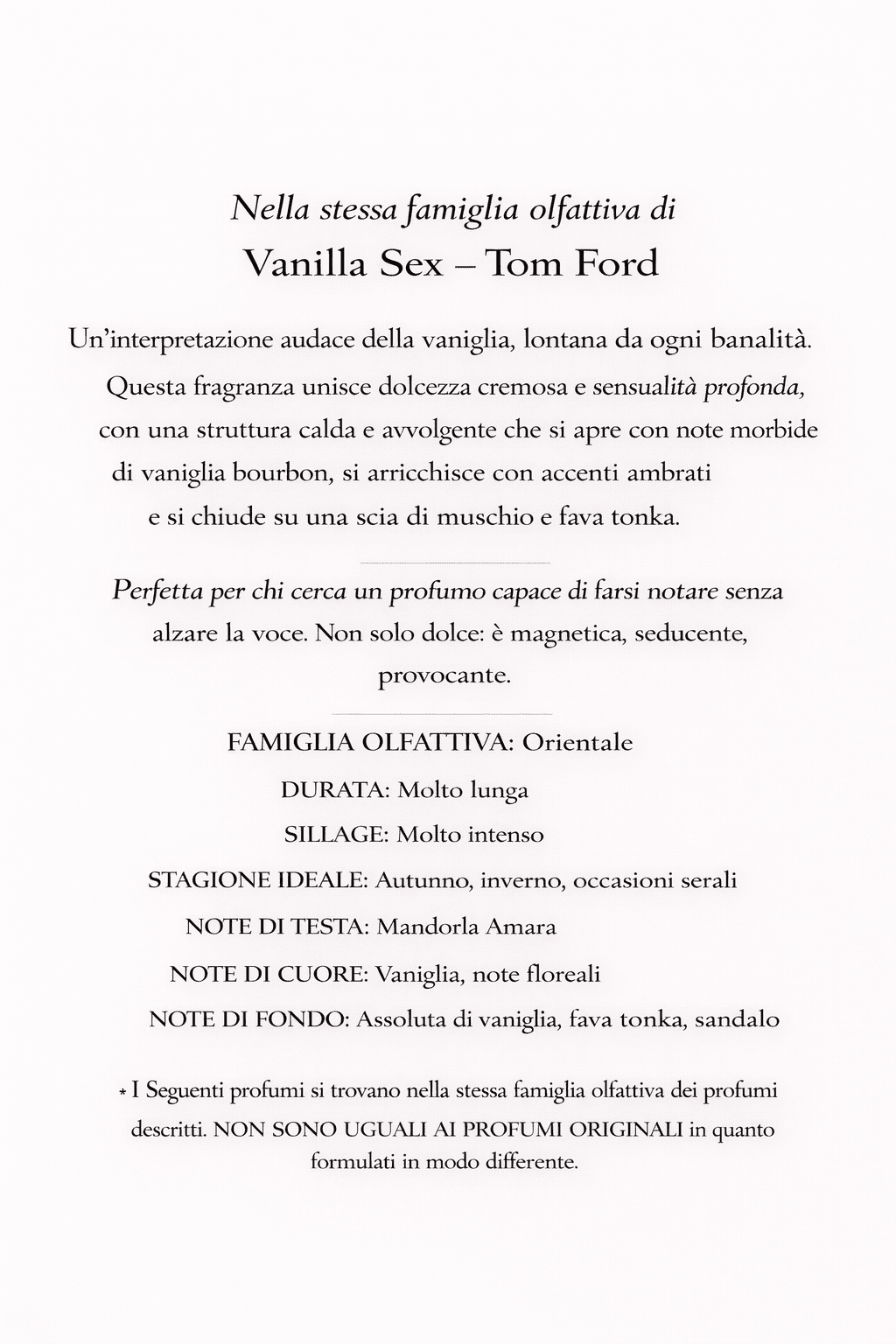 Questa fragranza unisce dolcezza cremosa e sensualità profonda, con una struttura calda e avvolgente che si apre con note morbide di vaniglia bourbon, si arricchisce con accenti ambrati e si chiude su una scia di muschio e fava tonka.