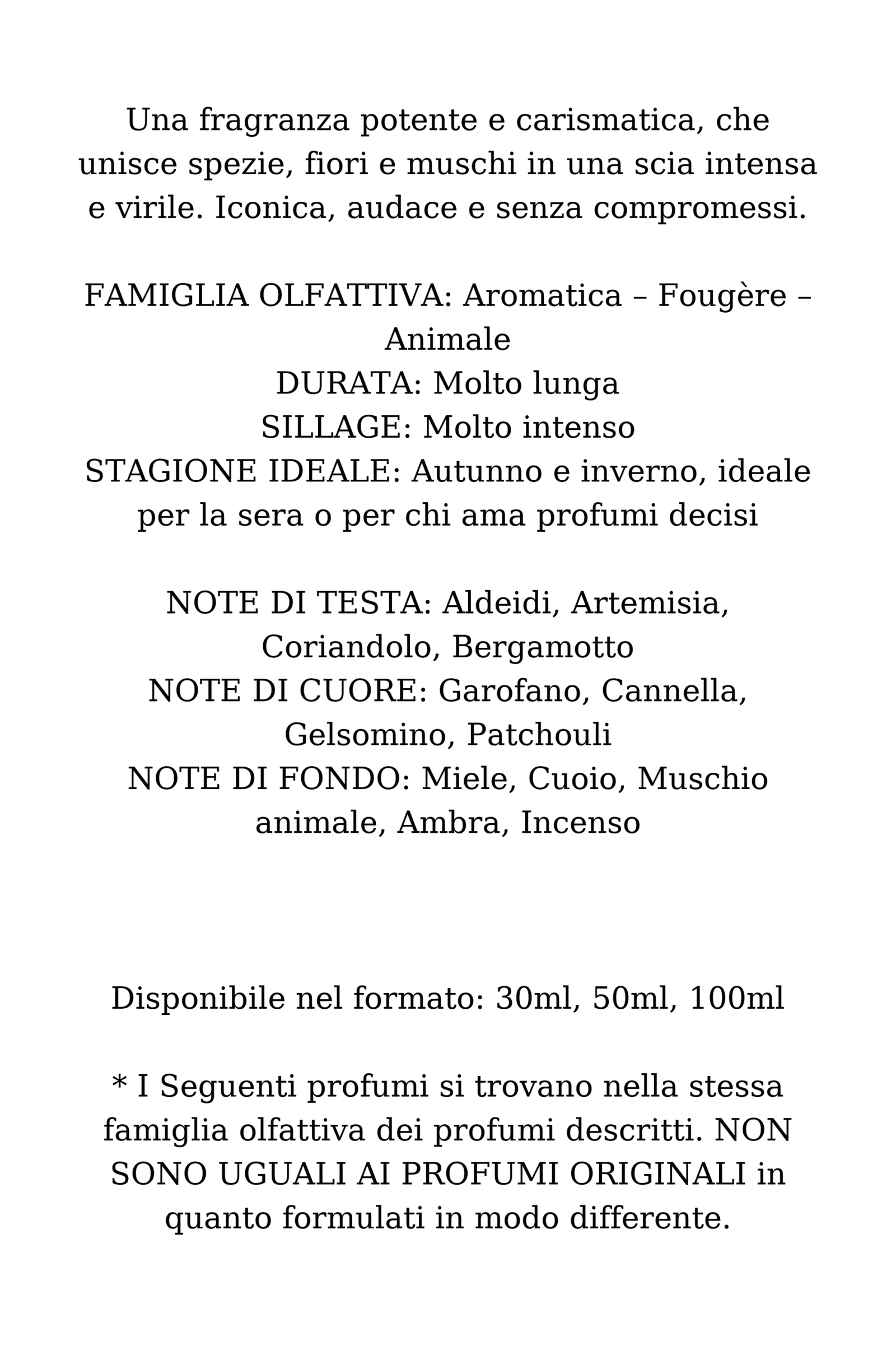 Una fragranza potente e carismatica, che unisce spezie, fiori e muschi in una scia intensa e virile. Iconica, audace e senza compromessi.